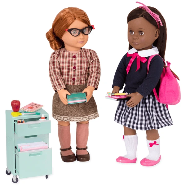 Das A, B, C in jedem Klassenzimmer! Dekoriere dein Klassenzimmer und das Lernen wird zum Spaß! Das Our Generation Klassenzimmer-Spielset für ist mit allem, was du für den Unterricht brauchst, vollgepackt! Verwende dieses Zubehörset allein oder in Kombination mit weiteren Our Generation Schulspielsets für noch mehr Spaß! Welche Puppe wird heute die Lehrerin sein? Ziehe deiner Lieblingspuppe die süße Lehrerbrille an, damit sie auch alles gut sehen kann. Der hübsche hellblaue Rollcontainer kann alle Dinge der Lehrerin aufbewahren. Dort kann man auch hervorragend das Goldfischglas abstellen. Wie wird die Klasse den Fisch wohl nennen, vielleicht Goldi? Mit allen Arten von Mini-Puppenschulbedarf wie Scheren, Heftern, Buntstiften, Notizbüchern und vielem mehr ist dieses Set für einen Schulalltag der OG Puppen gerüstet. Der Puppen-Rucksack ist der perfekte Ort für, um die Schul-Materialien aufzubewahren und zu transportieren.Inhalt: 1 Rollcontainer, 1 Goldfischglas, 1 Brille, 1 Lehrernotizbuch, 1 Apfel, 1 Flasche Klebstoff, 1 Klebeband Abroller mit 1 Rolle Klebeband, 1 Hefter, 2 Stifte, 2 Textmarker, 1 Schere, 1 Lineal, 1 Radiergummi, 1 Bleistift mit 1 Radierkappe, 1 Bleistiftanspitzer, 1 Box mit 6 Buntstiften, 1 Satz mit 8 Karteikarten, 2 Aktenordner, 1 Notizblock, 1 Textbuch, 1 Heft, 30 Einzelblätter, 2 Stickerbögen, 1 SchulranzenGröße Produkt (cm): x x Größe Verpackung (cm): 38,74 x 9,86 x 34,29